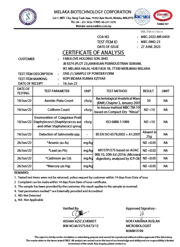 Produk Kopi Bidara Kurma telah diuji secara klinikal & bebas daripada bahan kimia berbahaya.